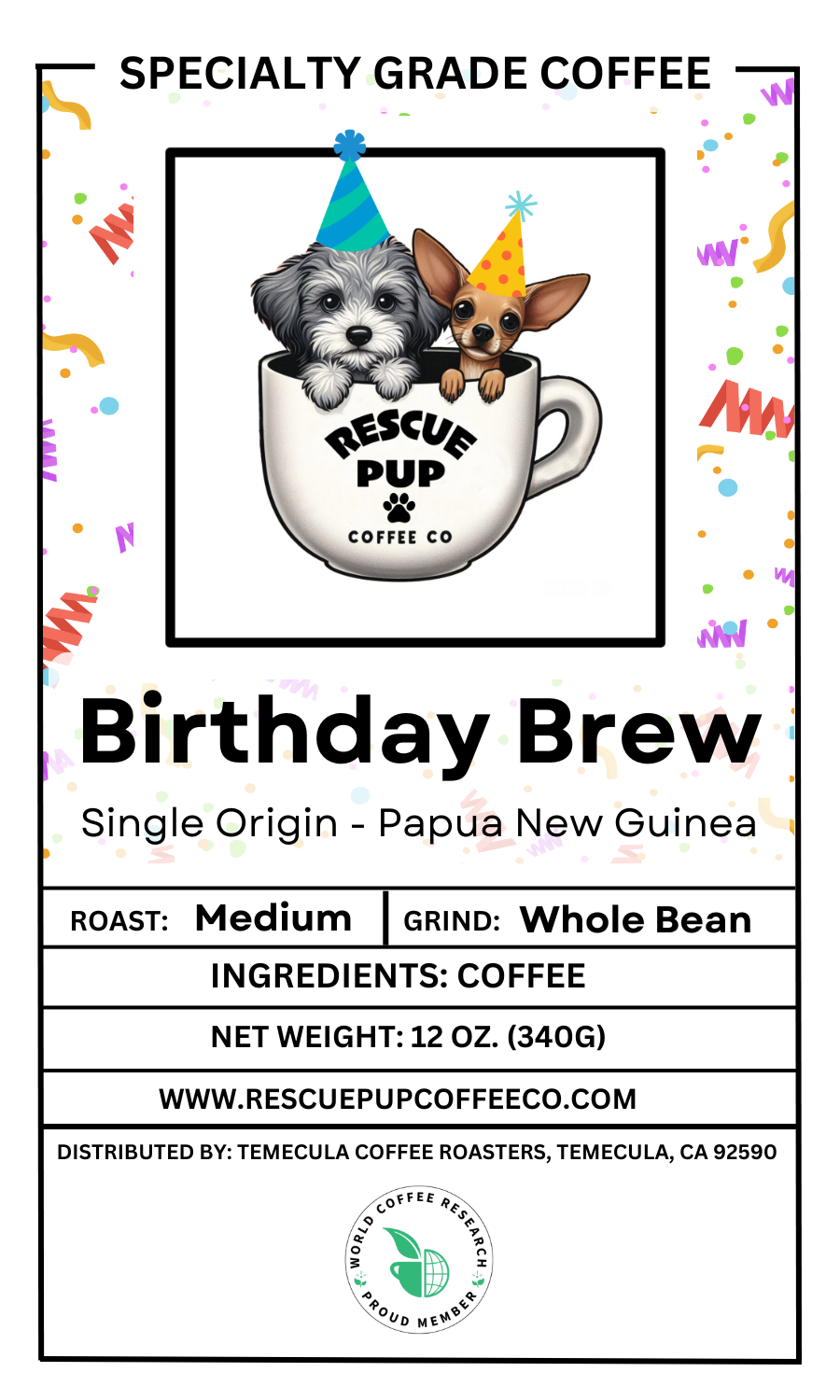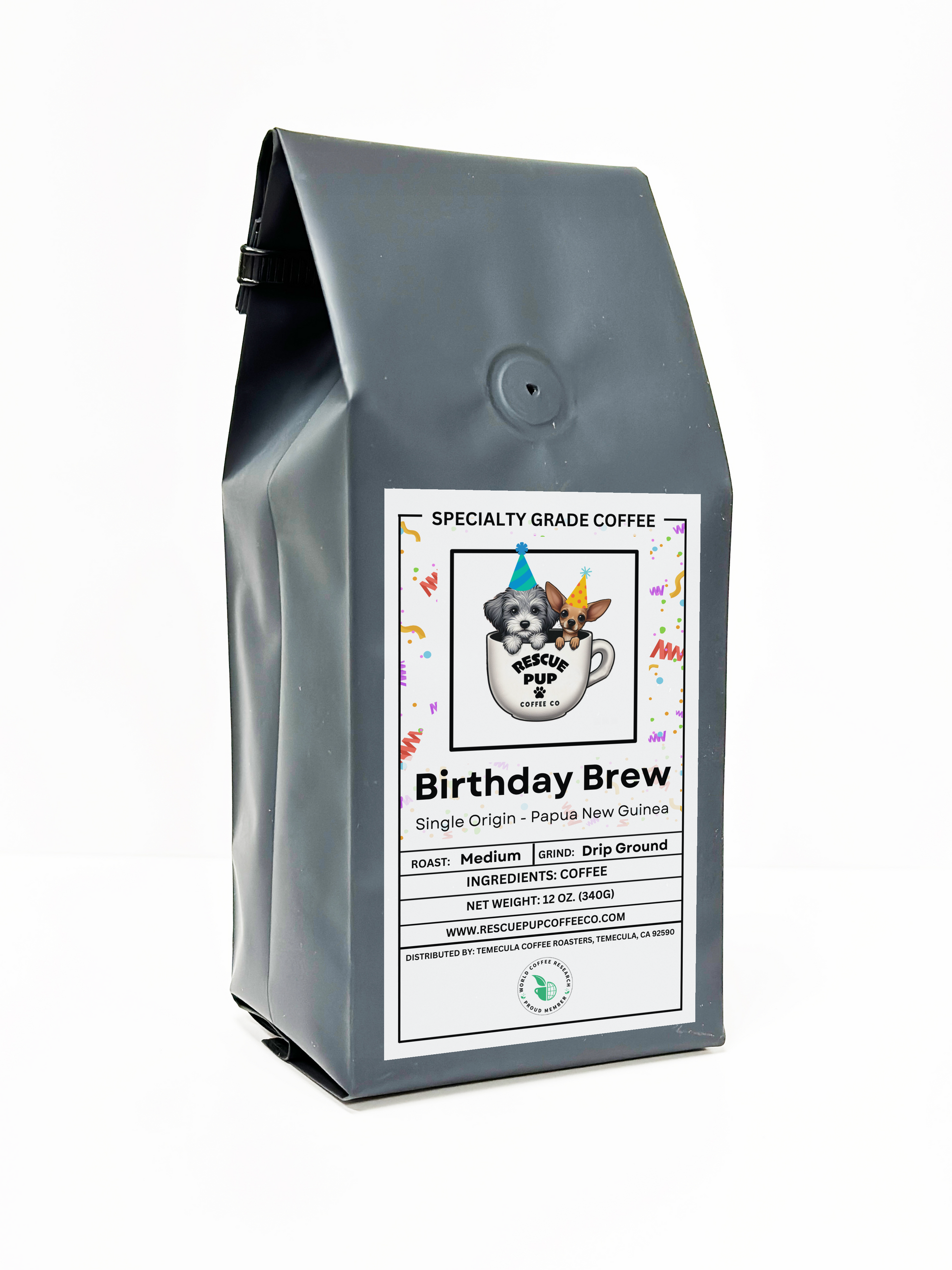 Celebrate with our Birthday Brew! This playful medium roast from Papua New Guinea dances with delightful notes of caramel, honey, and fruit. We've crafted this special Single Origin blend to mark one year of tail-wagging coffee adventures at Rescue Pup Coffee Co. Every sip is a party in your cup – no birthday hat required!